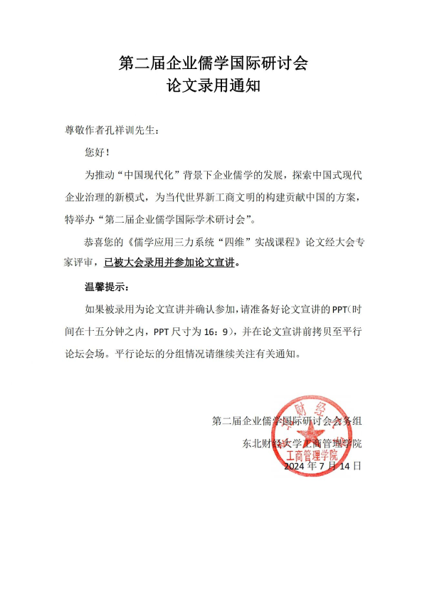 儒学应用三力系统“四维”实战课程,其案例论文被“东财工管院”收录